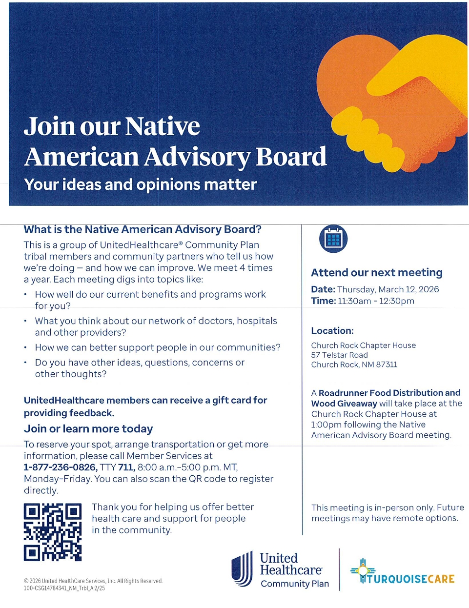 At Churchrock Chapter, Thursday, March 12, 2026 from 11:30 AM – 12:30 PM. Unitedhealthcare members can receive a gift card for providing feedback. To reserve your spot, arrange transportation or get more information, please call Member Services at 1-877-236-0826, TTY 711, 8:00 AM – 5:00 PM, MT. Monday – Friday. You can also scan the QR code to register on flyer at the bottom of web page.
